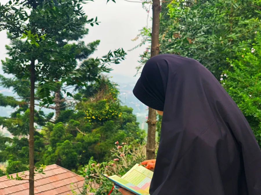 Sementara itu, santri putra sering memilih lapangan terbuka atau area yang menghadap langsung ke Gunung Gede dan Gunung Salak. Dari sana, mereka bisa menyaksikan hijaunya pepohonan dan hamparan langit yang luas—pemandangan yang secara alami menumbuhkan rasa syukur dan kedekatan kepada Allah. Ketika angin berhembus lembut dan suara bacaan Al-Qur'an terdengar merdu, suasana berubah menjadi sangat menenangkan dan penuh keberkahan.